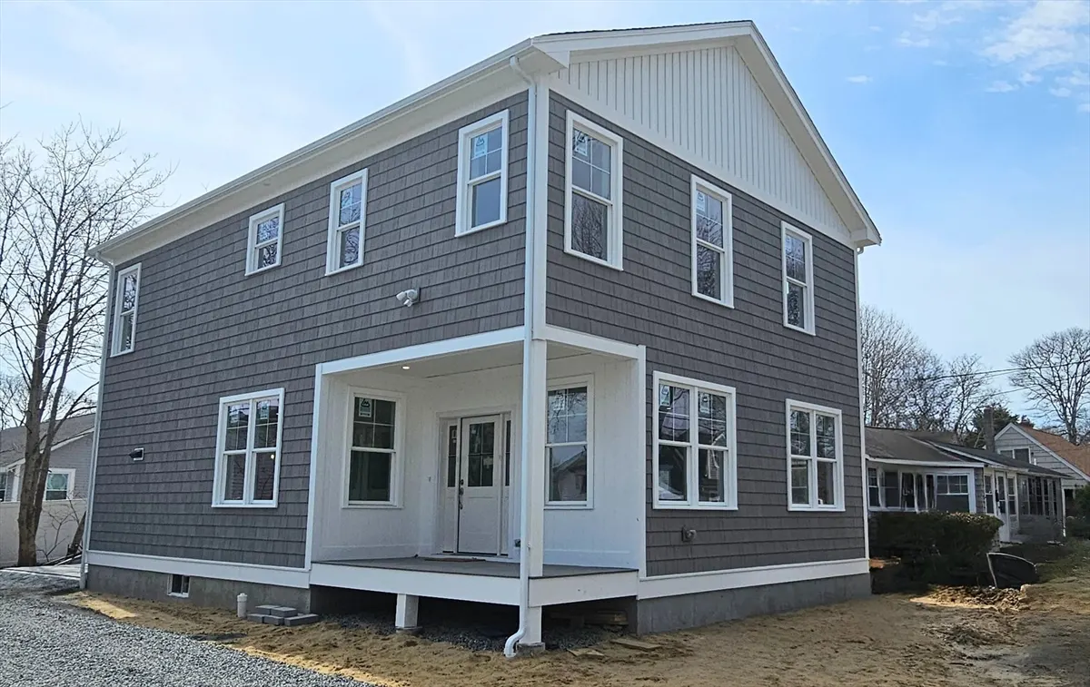 Experience modern coastal luxury in this stunning new construction 4-bedroom, 3-bathroom Colonial. Boasting water views from the great room and peek views from the second-floor primary suite, this home features an open floor plan with 9ft ceilings and a convenient first-floor bedroom. The interior is defined by high-end finishes, including a gourmet kitchen with GE Caf appliances, maple cabinetry, and quartz countertops. The spa-like master bath features custom marble showers and heated marble flooring, complemented by elegant hardwood and tile throughout. Located just 250 feet from the neighborhood beach on Great Pond, you are steps from the walking path to Bristol and Falmouth Heights beaches. Nature lovers will enjoy the nearby Coonamessett River, a tidal haven for "salter" trout. Perfectly suited for the maritime lifestyle, this energy-efficient home is only two blocks from the town boat ramp and includes a 65ft driveway for boat storage. Buyer to assume sewer betterment.